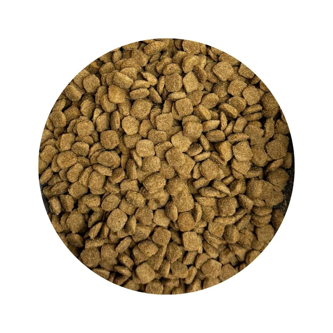 Cereales 20% maíz, carnes y subproductos animales (pollo 15%), subproductos de origen vegetal, aceites y grasas, sustancias minerales, leches y productos lácteos (1000 mg/kg de yogur) y levaduras.